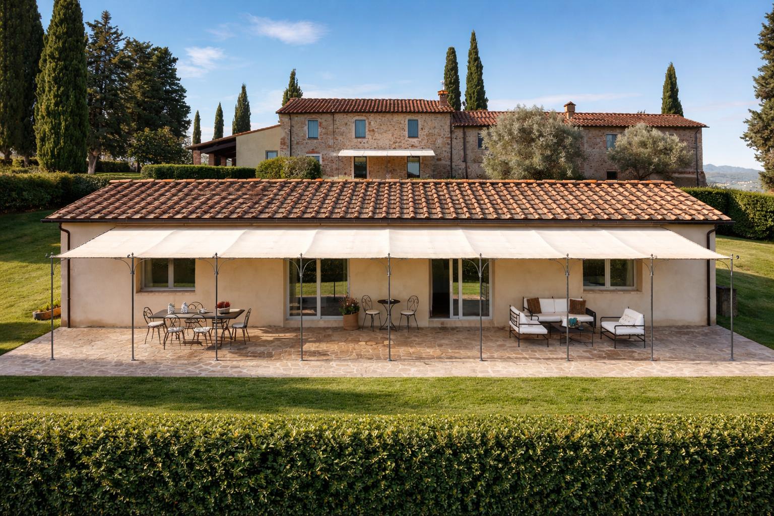 Soggiorno con cucina, 2 camere doppie e due singole, 2 bagni con doccia e ampio giardino privato recintato con mini piscina per il vostro relax.